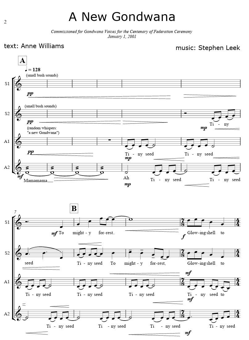 A New Gondwana (SSAA) – Morton Music Exclusive #MM0969 By Stephen Leek Voicing SSAA Description Reviews Previews New Release – One of Stephen Leek’s exclusive digital releases directly through Morton Music – email admin@mortonmusic.com for details. https://www.stephenleek.com/wp-content/uploads/2008/11/a-new-gondwana-sample.mp3 Coming soon More A Gibber Plains Noel – Morton Music Exclusive A Red, Red Rose