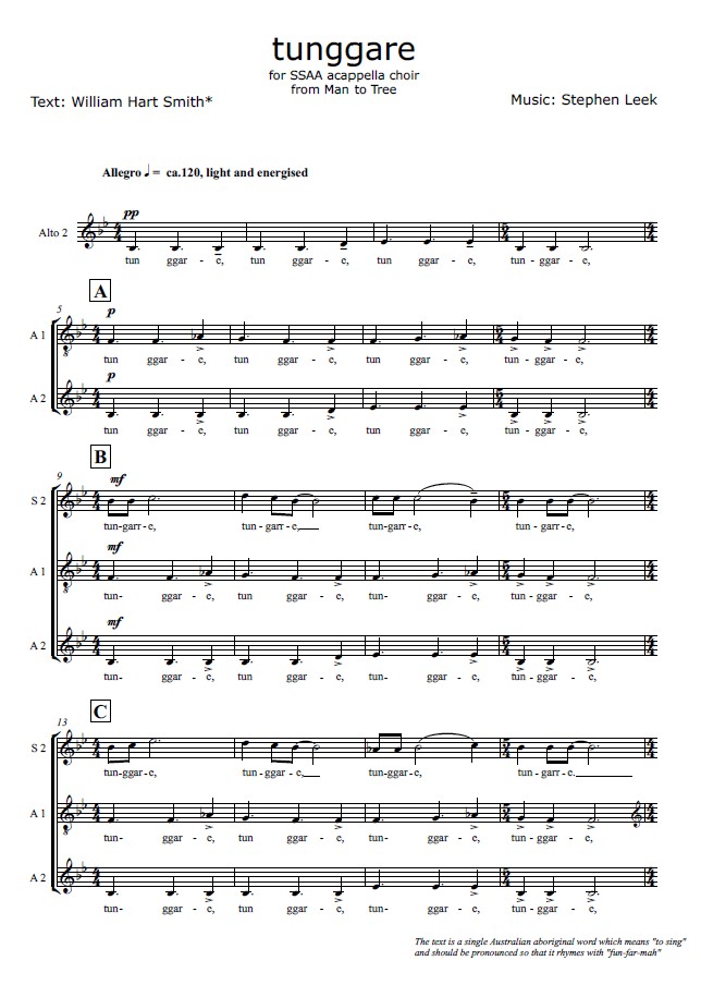 | Tunggare is a popular and accessible work that captures the joy of “welcome”, suitable for high school and community choirs and is arranged for SATB SSAA and SSAA Bb. There is one easily overcome challenge where singers are face with five beats every four bars. This can provide much mirth to the choir when someone gets it wrong. |